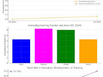 The National Bureau of Statistics (NBS) reported in 2022 that 133 million Nigerians live in multidimensional poverty. As of early 2024, over 106 million people live on less than $2.15 per day. The Q1 2024 unemployment rate stood at 5.3%, with women disproportionately affected at 6.2% unemployment compared to 4.3% for men.