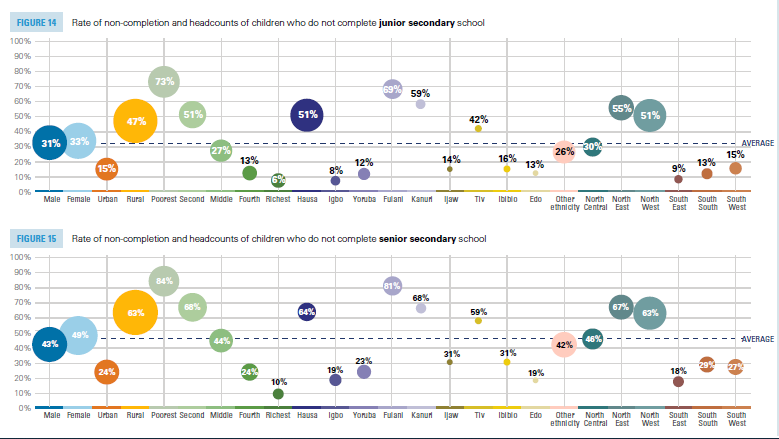 For every classroom of Nigerian girls, nearly half will never sit for their final secondary exams. According to a 2023 Nigeria Education Fact Sheet published by the United Nations Children’s Fund (UNICEF) in April 2024, which analysed learning and equity using NBS’s MICS data of 2021, the non-completion rate for girls is 33 per cent at junior secondary level and rises to 49 percent at senior secondary level, compared to 31 per cent and 43 percent for boys. This gap, though seemingly small on paper, translates into millions of girls whose futures are cut short simply because of their gender.