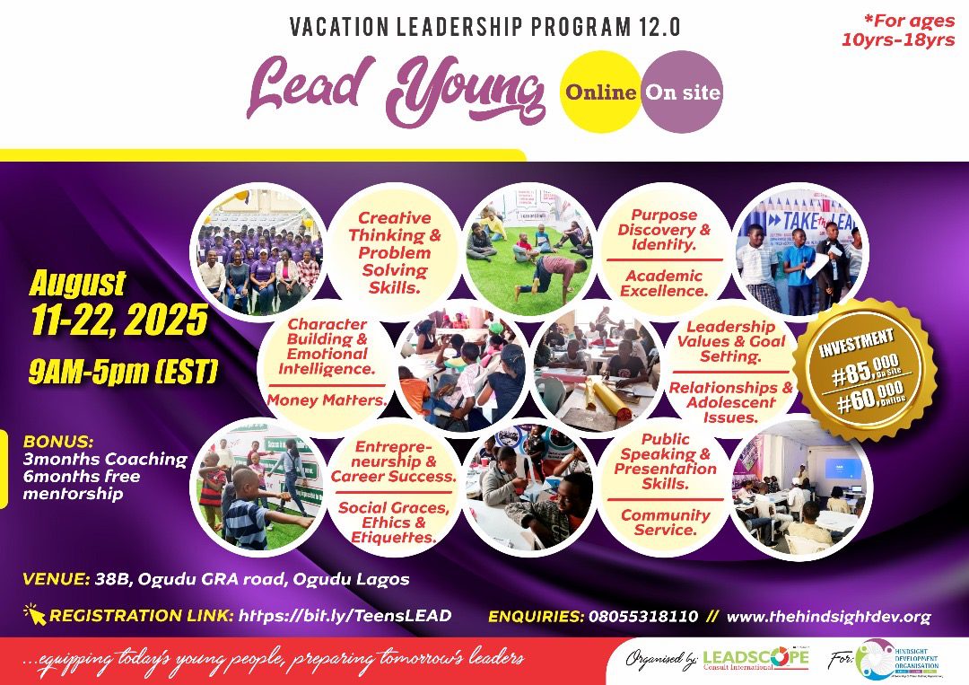 Parents and guardians interested in enrolling their children can register via https://bit.ly/TeensLEAD. For further enquiries, contact 08098555728 or email thehindsightng@gmail.com.