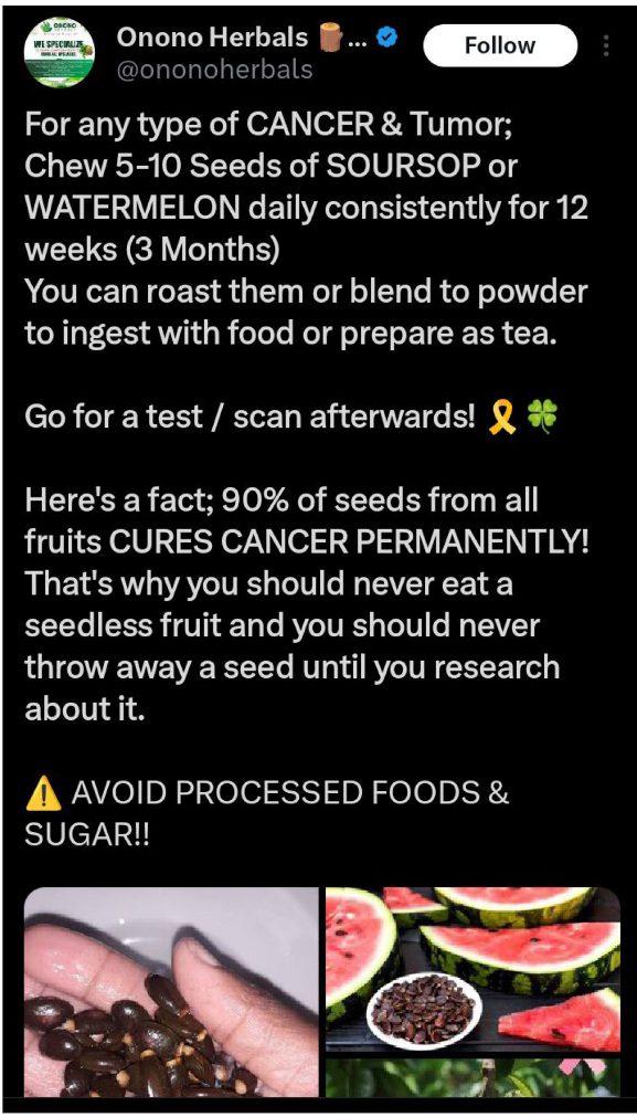 On the 4th of February, an X user (formerly Twitter) with the handle Onono herbals made a claim that chewing 5 to 12 soursop and watermelon seeds everyday for 12 consecutive weeks is capable of curing any tumour or cancer.
