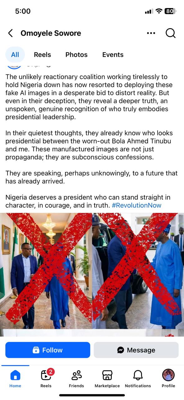 In their quietest thoughts, they already know who looks presidential between the worn-out Bola Ahmed Tinubu and me. These manufactured images are not just propaganda; they are subconscious confessions. They are speaking, perhaps unknowingly, to a future that has already arrived. Nigeria deserves a president who can stand straight in character, in courage, and in truth. #RevolutionNow”. All of which confirmed that the images are fake and misleading.