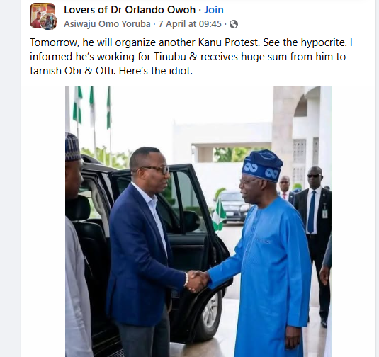 Also, we conducted a Google Reverse Image search of the first image and discovered that, while there is no news report or State account of such a visit, other social media pages have published the images, with different captions, such as ‘Asiwaju Omo Yoruba’ on the Facebook group ‘Lovers of Dr Orlando Owoh’, who published it on April 7, with the caption “Tomorrow, he will organize another Kanu Protest. See the hypocrite. I informed he’s working for Tinubu & receives huge sum from him to tarnish Obi & Otti. Here’s the idiot.”.