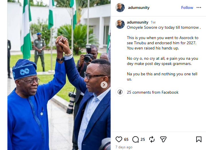 Also, Adumsunity on Instagram published it about a week ago with the caption “Omoyele Sowore cry today till tomorrow . This is you when you went to Asorock to see Tinubu and endorsed him for 2027. You even raised his hands up. No cry o, no cry at all, e pain you na you dey make post dey speak grammars. Na you be this and nothing you one tell us.”
