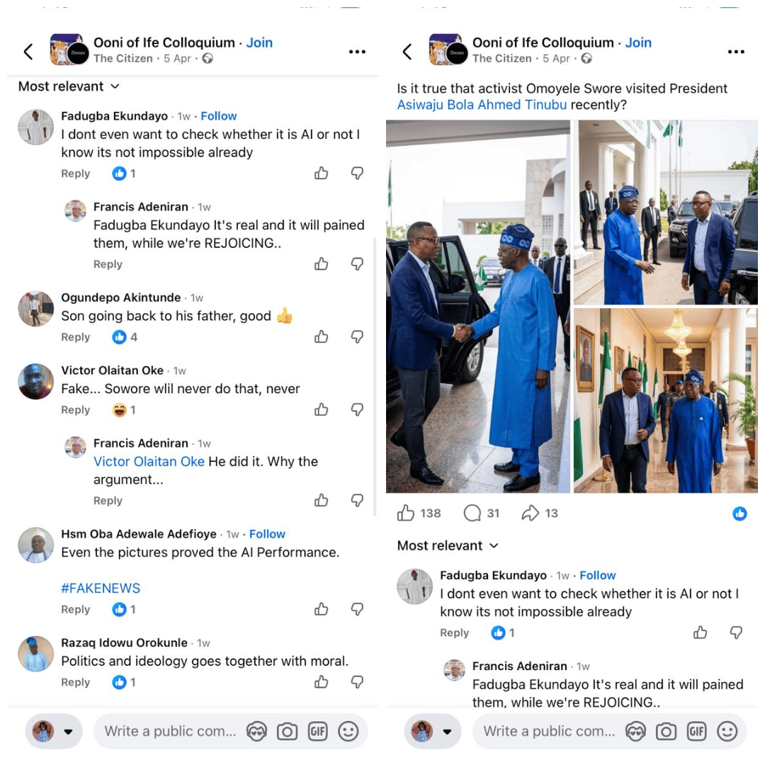 The images, totalling three, were shared on April 5, 2026, by a Facebook account, The Citizen, on a public group ‘Ooni of Ife Colloquium’, with the caption “Is it true that activist Omoyele Swore visited President Asiwaju Bola Ahmed Tinubu recently?”