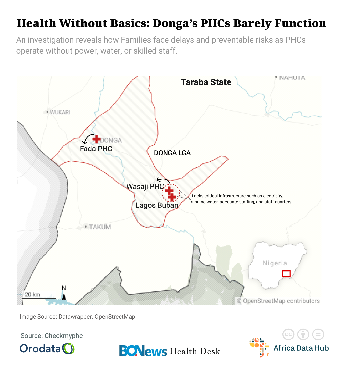 In the Donga Local Government Area (LGA) of Taraba State, Primary Health Centres (PHCs) and health posts meant to serve over 150,000 residents are operating without basic infrastructure and amenities. Data from Orodata’s CheckMyPHC platform and the National Primary Health Care Development Agency (NPHCDA) reveal that facilities such as the Wasaji Health Post, Lagos Buban Health Post, and Fada Primary Health Clinic lack essential amenities. This situation undermines healthcare delivery in the communities they serve and erodes public trust and confidence in the system.