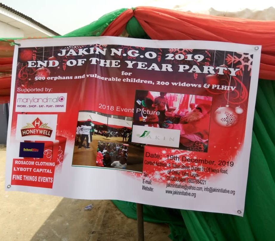 Lagos Based NGO, JAKIN  initiative has put smiles on the faces of 500 Orphans, Widows and less privileged children  living around Shomolu, Ilaje, Bariga and Yaba axis of Lagos, as it distributes food items, clothing items and drinks at her end of the year party.
