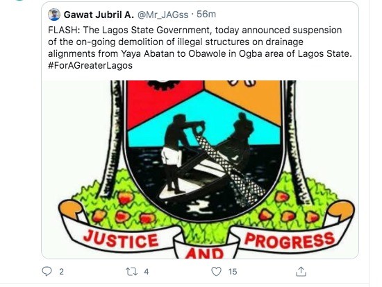 Later this evening, Senior Special Assistant (SSA) to the Governor on New Media, Gawat Jubril announced the suspension of the demolitions from Yaya-Abatan to Obawole.