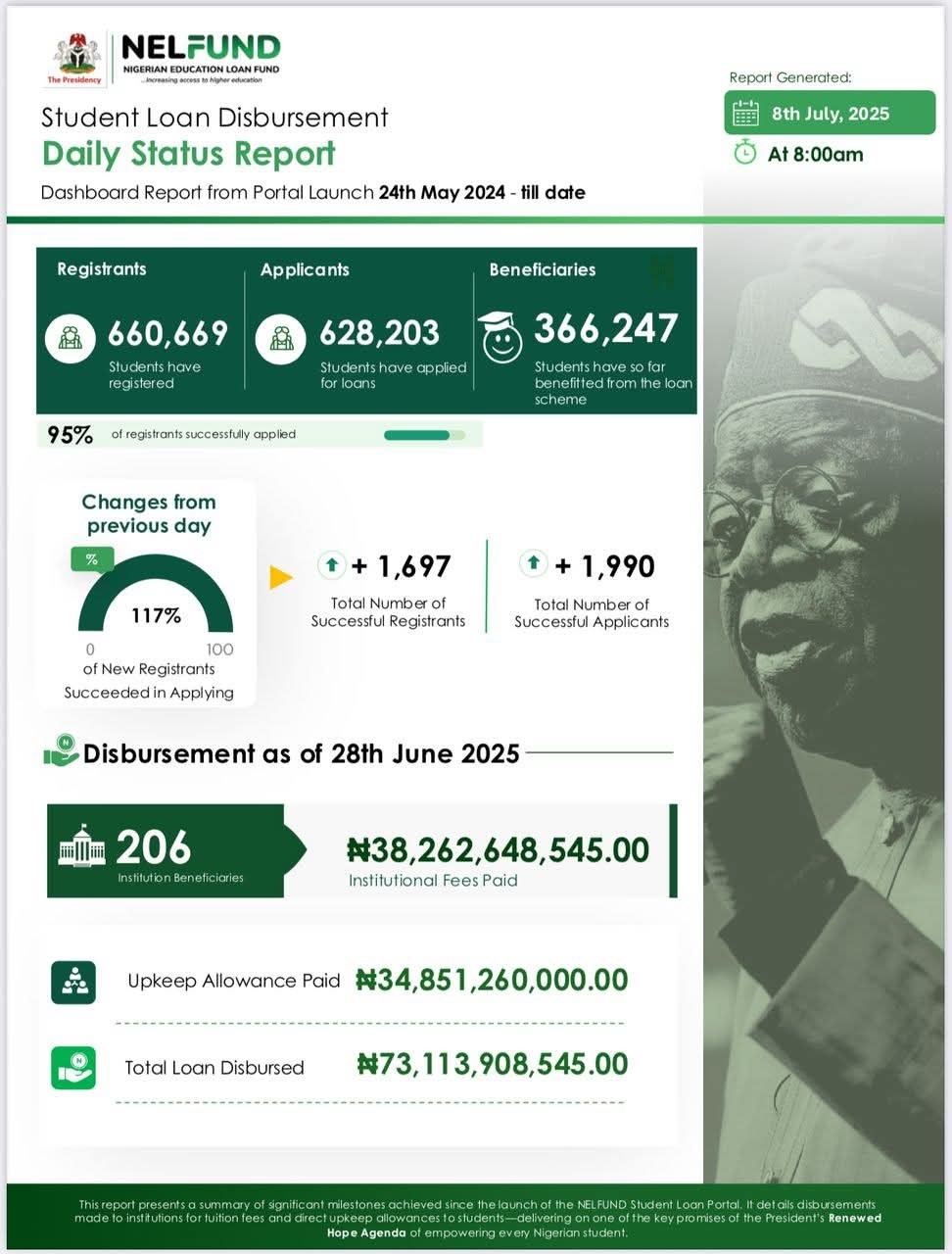 This data was revealed in NELFUND’s Student Loan Disbursement Daily Status Report of Tuesday, July 8, 2025, posted on its social media pages, capturing disbursement up to June 28, 2025.