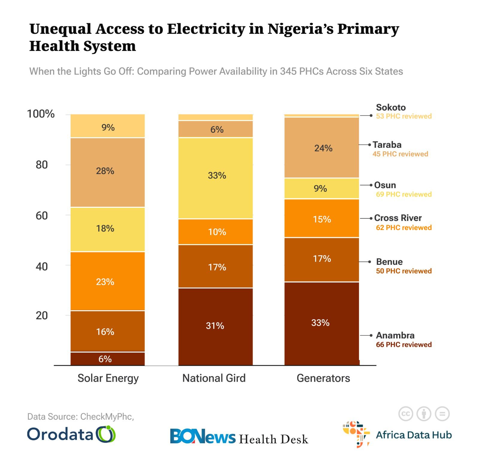 The data, drawn from 345 PHCs across Osun, Anambra, Benue, Cross River, Sokoto, and Taraba States, shows that two out of every three facilities do not have a reliable source of power. Only about 45 per cent are connected to the national grid, and even among these, power supply is so inconsistent that health workers still struggle to keep operations running.